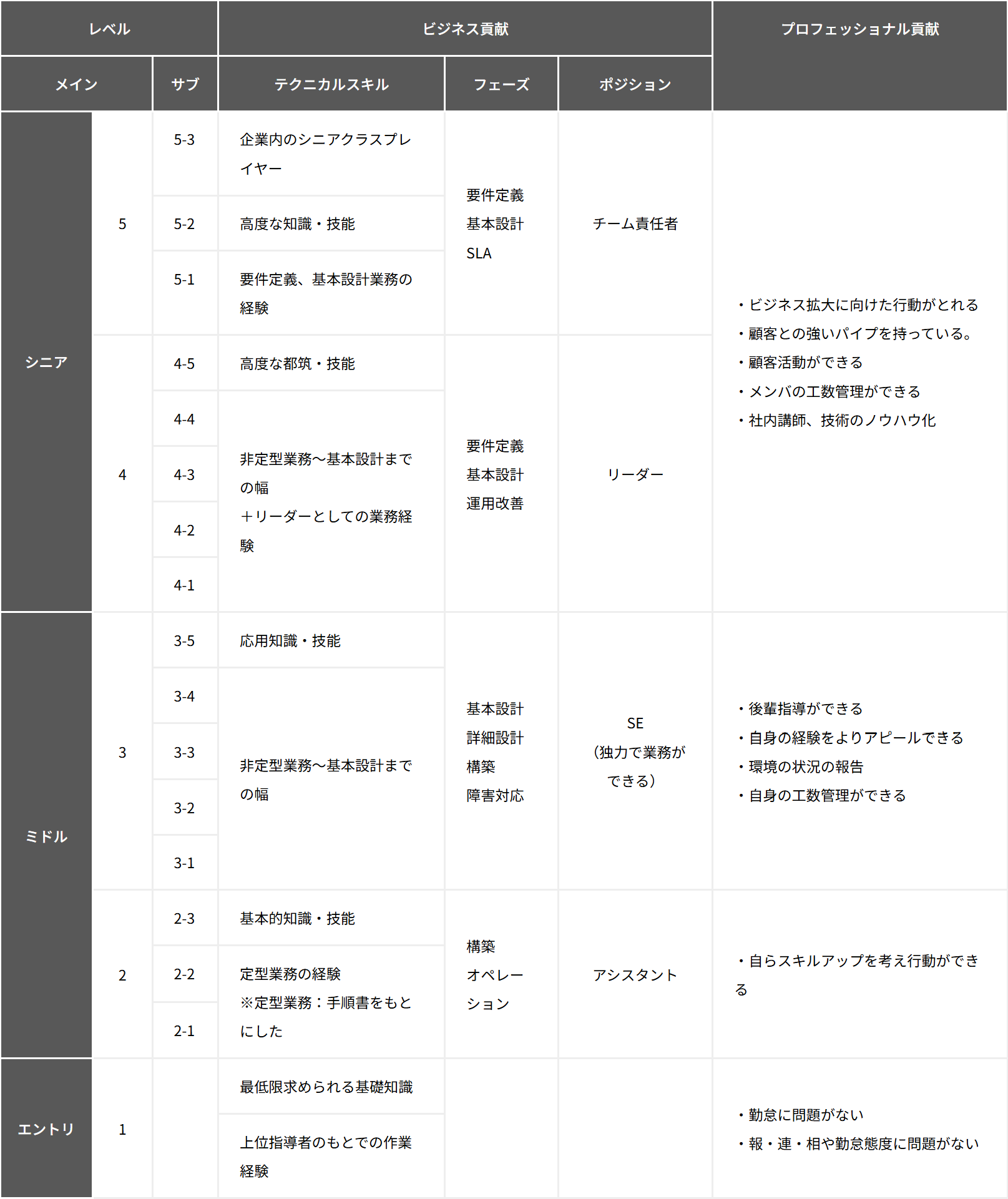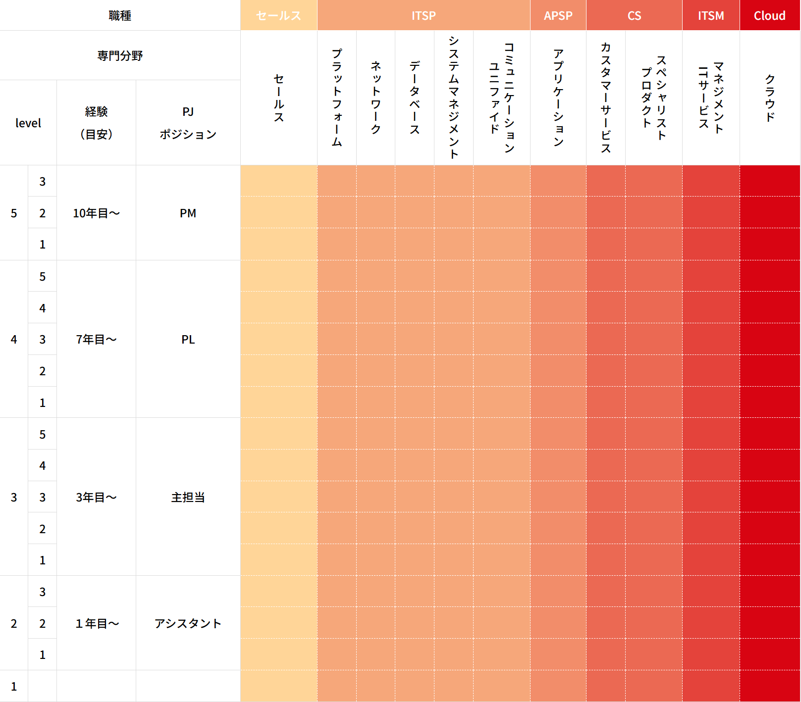 ロードマップでもあり評価制度でもあるGTSS。システムエンジニアといっても様々な専門分野があります。弊社では、各専門分野ごとに17段階で評価できる仕組みを作りました。